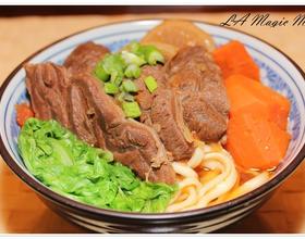 烫熟白面及白菜, 舀入牛肉汤, 再洒上葱花就完成这番茄牛肉面啰!