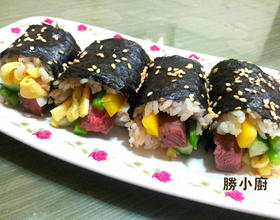 类似寿司的制作方法,可能小厨不喜欢太整齐,一个一个包不但不会破坏米饭还有一种自然的美感!!