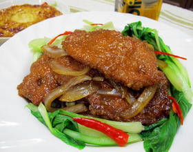 - 3. 取一锅, 倒入适量的橄榄油, 烧至中高温, 将里脊肉片放入锅中, 先以中小火半煎炸到呈金黄色时, 再转大火逼出肉里的油脂, 夹起沥干油份备用!