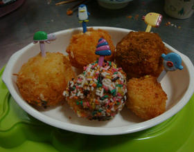 炸好的起司球可任意裹上喜欢的酱料,如花生粉,可可粉,彩色糖粉....