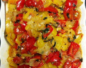 炒香洋葱,加入彩椒、番茄以及蒜末、一半的九层塔,小火盖闷约20分钟