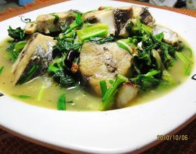 等小白菜变软,鱼汤变白,关火,加韭菜段、芝麻油调味。