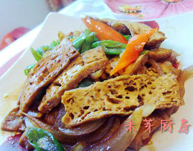 开炒了,炒豆腐的配菜可以随自己的喜好定,我这次用的是家里现成的材料:洋葱和尖椒,按照自己喜欢的方式切好。