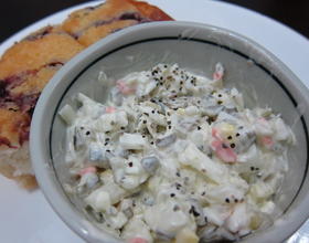 酸黄瓜、洋葱及水煮蛋都先切碎,加入美奶滋、柠檬汁拌匀再加黑胡椒粒提味。