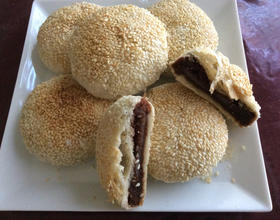 - 8. 整形后略按扁刷些水在表面沾上炒香的白芝麻。排放在烤盘中,芝麻面朝下。