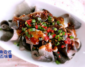 准备一锅水煮沸,放入鱼皮,待水再度沸腾约1分钟,捞起鱼皮并沥干水分,放入盘中。