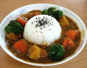 - 5. 摆盘─先加咖哩到扁盘,把白饭装入小饭碗后倒扣,洒上黑白芝麻于饭上,再插几朵花椰菜即可