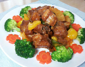 锅中加入酱汁煮开放入甜椒、小排、凤梨片煮到酱稍收干即可盛盘