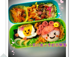把南瓜炒过放芝麻待用,把饭成团放上火腿,煎蛋后摆盘即可