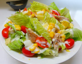 泡过冰水的萝蔓叶撕成块状,鸡肉煎过后切块,鸡蛋也切块,再将所有材料放上去,最后再淋上凯撒酱即可~