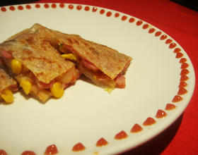 在依序放上起司丝->火腿丁以及玉米粒->起司丝->黑胡椒以及番茄酱
