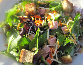 如果买不到已经配好的沙拉,也可以用一般任何蔬菜代替。美国人最常用的沙拉酱是“ranch“。 这个ranch沙拉酱也可以自己做的。其实市面上有很多种沙拉酱,那随自己的口味哦!干面包做法:拿一片面包在小烤箱烤一烤就硬了。
