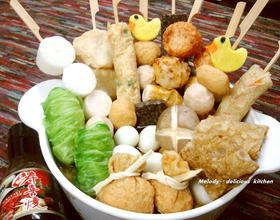 将菜头加入煮至5分熟,再加入关东煮、猪血糕、香菇、豆皮、鸟蛋、甜不辣、杂烩、高丽菜卷开始煮至熟成即可...