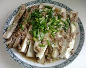 - 1. 材料:茄子洗干净切条,姜蓉和蒜蓉少许,葱切粒。剁碎的半肥瘦猪肉