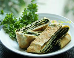 倒入1/3的蛋液,铺上适量菊苣,待蛋液凝固,边缘出现稍稍金黄可分离时盛出。