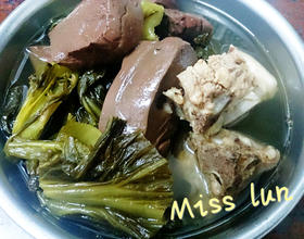 将咸菜段放入锅中,再放入烫过的排骨、猪血块,倒入5-6小碗水,水滚(中大火)煮约15分钟即可完成