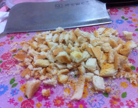 将烤至酥脆的吐司边用刀大致上剁的碎碎的
