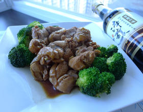 锅里先放少许油,加入已川汤好的鸡腿肉及菜心拌抄。