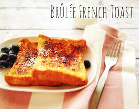 将1/4小匙黑糖均匀撒上一片法式吐司,以喷枪将黑糖加热至融化变成焦糖状,再撒上1/4小匙黑糖,再次以喷枪烤成焦糖直至法式吐司表面形成一层薄脆的焦糖。