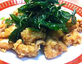 第一次炸好的盐酥鸡在下锅炸一次,起锅再炸罗勒, 香喷喷上桌了
