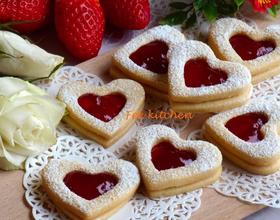 - 4. 将面团擀至3毫米厚,用压模压出数个心型,一半中间压出一个小心形洞