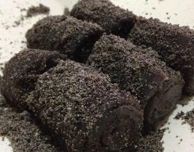 蒸熟的铁盘放凉,热的时候很难卷起噢,还会留下手指印,不要心急。坐冷水可加速冷却。放凉后用手卷起芝麻片,切成适合食用的长短度即可﹗