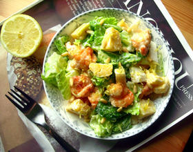 - 5. 将所有材料加沙拉酱拌匀,最后再撒上松子与柠檬皮丝就完成了!