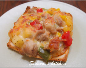梨,续入红椒青椒略拌加入盐,黑胡椒. - 5. 炒好的食材平均放在吐司皮上,再放上玉米粒,撒少许起司丝,