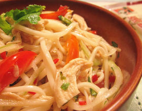 鸡胸肉抺上少许的米酒,外锅放半杯水电锅蒸熟.起一锅水煮面