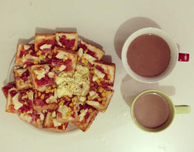 - 3. 然后将土司抹上一包早餐店或麦x劳的番茄酱,然后加上先前考好的火腿丁及玉米粒,然后再将干酪撕碎放在料上面,放入烤箱,上下火考四分钟,然后在只开上火考三分钟,就完成啰~