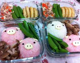 粉红小猪的做法也很简单~~拍卖网站有卖日本的樱花素将其拌入白饭中染成粉红色(没有樱花素也可以番茄酱炒饭代替)~将饭捏成适当大小的圆型饭团~然后将起司刻椭圆形放置在饭团的中间放上两颗黑芝麻在起司上当小猪鼻,再刻两个三角形当耳朵,将烧海苔刻小圆型当眼睛,就完成小猪的脸了