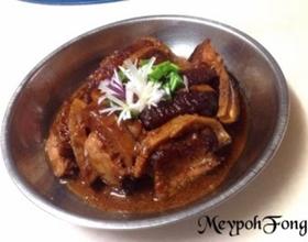 - 1. 花肉放在滚水里大火煮20分钟,取出,然后放进冷水里浸泡至冷却,拿起外皮抹干水分然后刺上小洞洞,再涂上酱油和酱油,放进热油里以中火炸香之金黄色(皮朝下),取出,马上泡进冰冷水中大概20分钟,沥水,切成厚片~