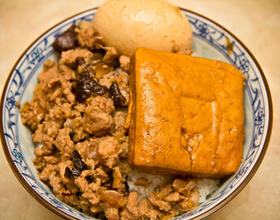 加入香菇粒,油葱酥,再炒香加入酱油、糖、胡椒枌、五香枌、炒到入味。