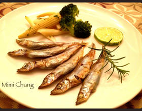 将擦干撒好胡椒盐及新鲜迷迭香的柳叶鱼排在烤盘上。
