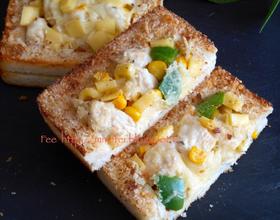 - 4. 土司片(ㄧ份2片)ㄧ片在中间剪出方型洞(如图), 二片间涂上蛋白(烤时会贴合), 将奶油鸡肉放入中间方型洞, 撒上喜欢的熟蔬菜,乳酪丝.于上层土司周围涂上蛋白,撒上少许面包粉