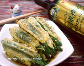 热锅倒油,沾好蛋液的秋葵,入锅中煎至金黄即可..
