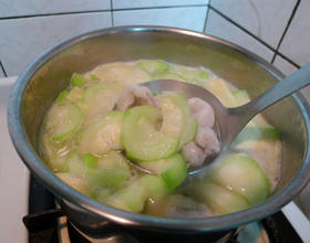 将鱼饺,蛋饺及丝瓜,虾米放入锅中煮