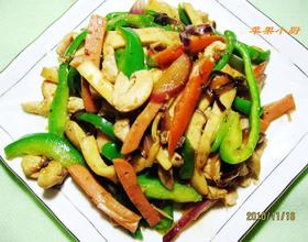 当杏胞菇煸炒玻发黄变软时加入青椒和小甜肠。