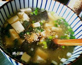 清淡的海带高汤继续煮,取3大匙的味噌用滤网慢慢渗入汤中(过滤掉味噌中的豆渣)切小片的海带再回锅一起煮