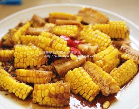 - 4. 加入一大匙酱油和一大晚热水,热水必须淹至玉米的一半,