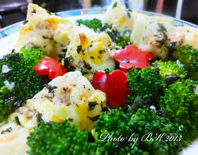 - 4. 绿花椰及红甜椒(压模成花状)汆烫备用。