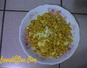 锅入油烧热,加入蛋液炒成炒蛋,加入玉米粒、盐,炒干水份、炒熟、炒出甜味即可盛盘。