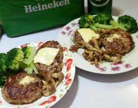 拿一漂亮盘子开始摆盘,肉排放中间,烫好的花椰菜,和上了色的海鲜菇放旁边,淋上刚刚的酱汁,最后爱吃起司的可以在汉堡排上再加一点起司就大功告成!