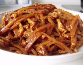放入肉丝炒匀,加盐、糖、醋、老抽调下味,炒匀就可以了