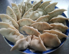 - 7. 将内馅放在水饺皮中间后,包起来,即可完成水饺了喔