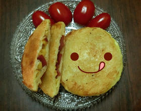 将炒好的料放在吐司中间加上起司片,外围用打匀的蛋液抹一圈后重叠压紧