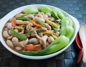 另取锅爆香姜片,放入鸡佛及所有蔬菜,加入蚝油及水翻炒。