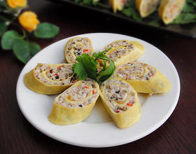- 9. 把蛋皮平铺,在上面均匀地铺上一层馅料。