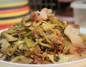 - 3. 锅里不放油,热锅,先把酸菜炒干水份,炒熟乘出待用。