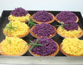 在塔饼上挤入打发的鲜奶油,放1/2个杯子戚风蛋糕再挤入打发的鲜奶油,最后挤出地瓜泥馅料即可。 - 6. 鲜奶油的量依个人喜好,斟酌量的多寡。
